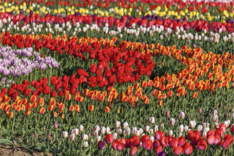 体験だけでなく、季節を通して咲く花々も見どころの一つ。3月から4月にはチューリップが見頃を迎え、定番の品種から珍しい品種まで、約6万本が咲き誇ります。円形に植えられた鮮やかなチューリップは、いつまでも眺めていたくなるような癒し時間を与えてくれますよ。
