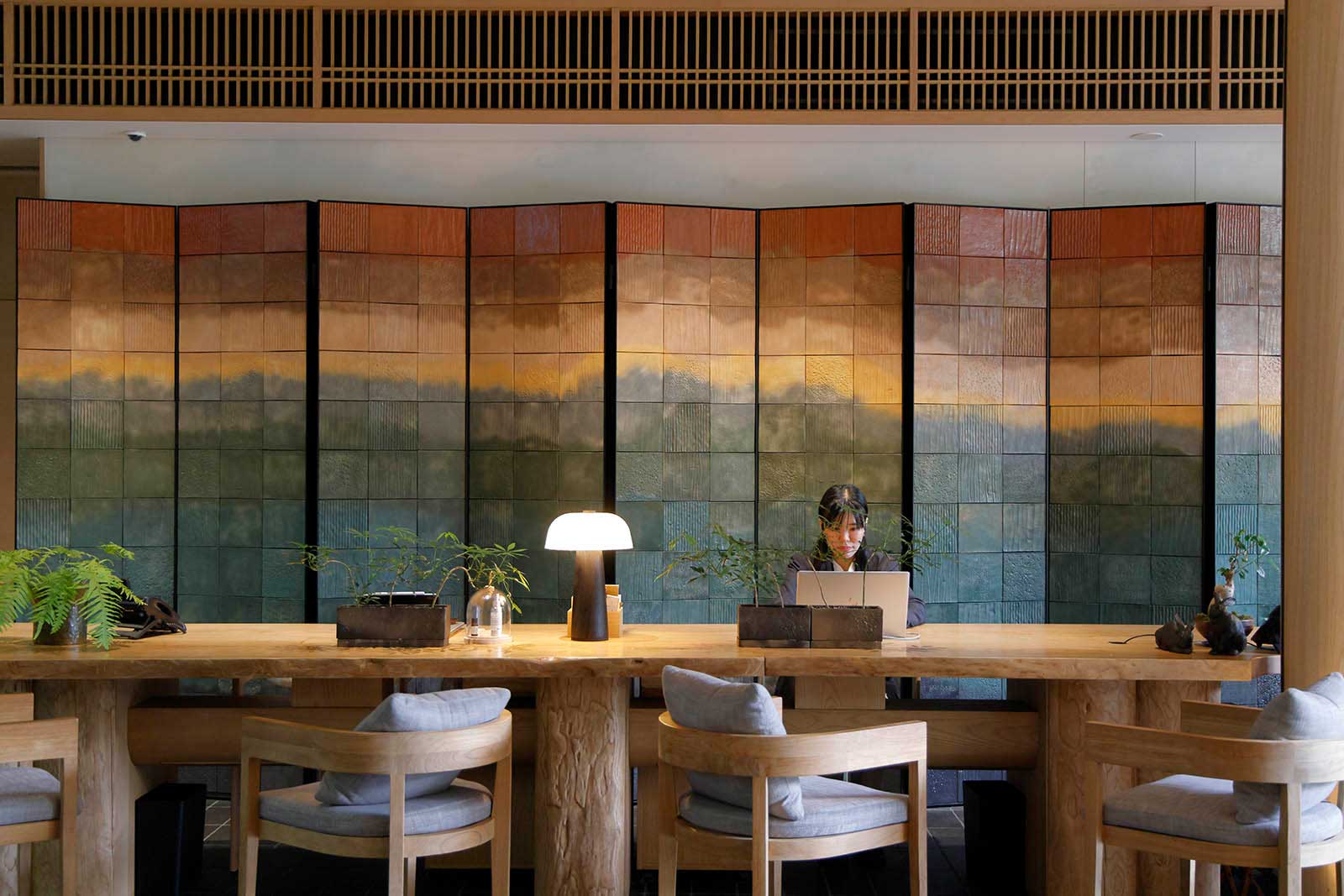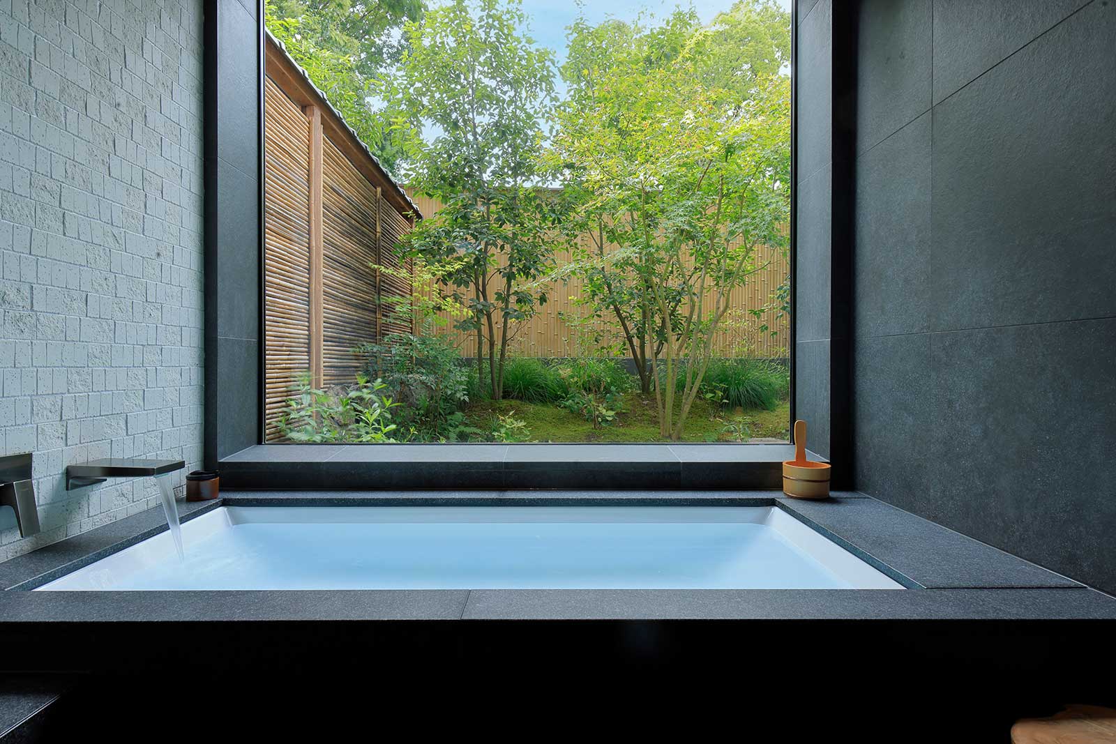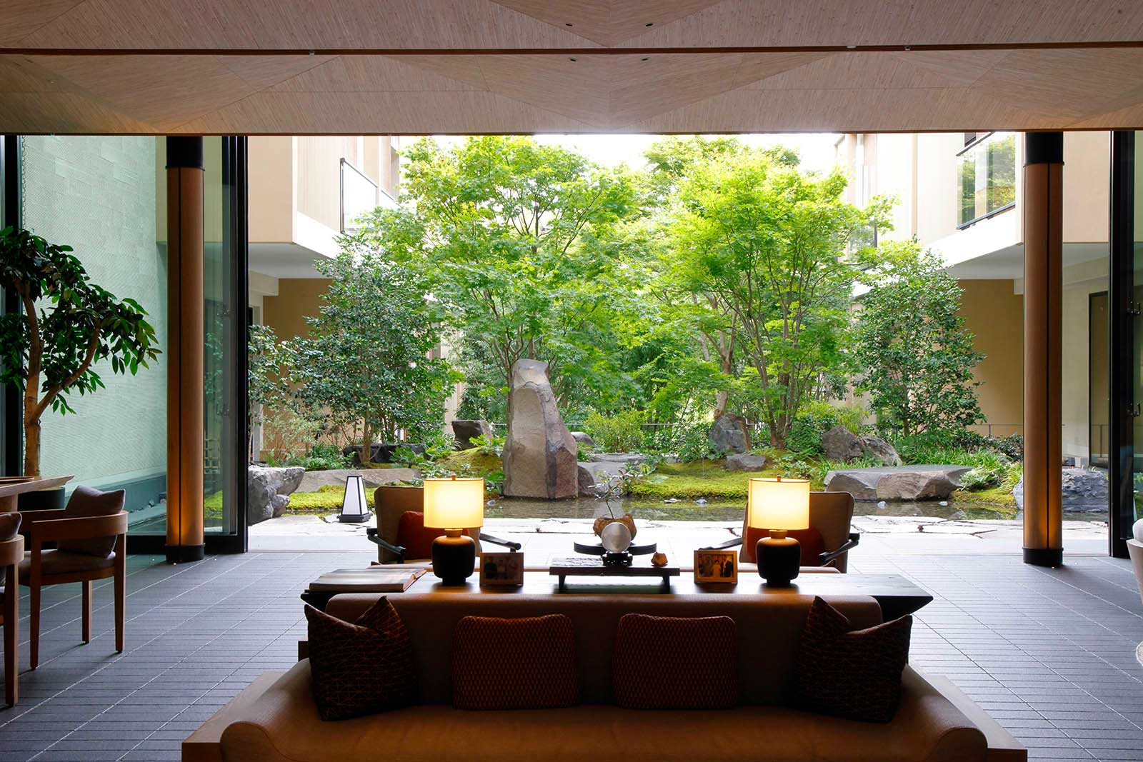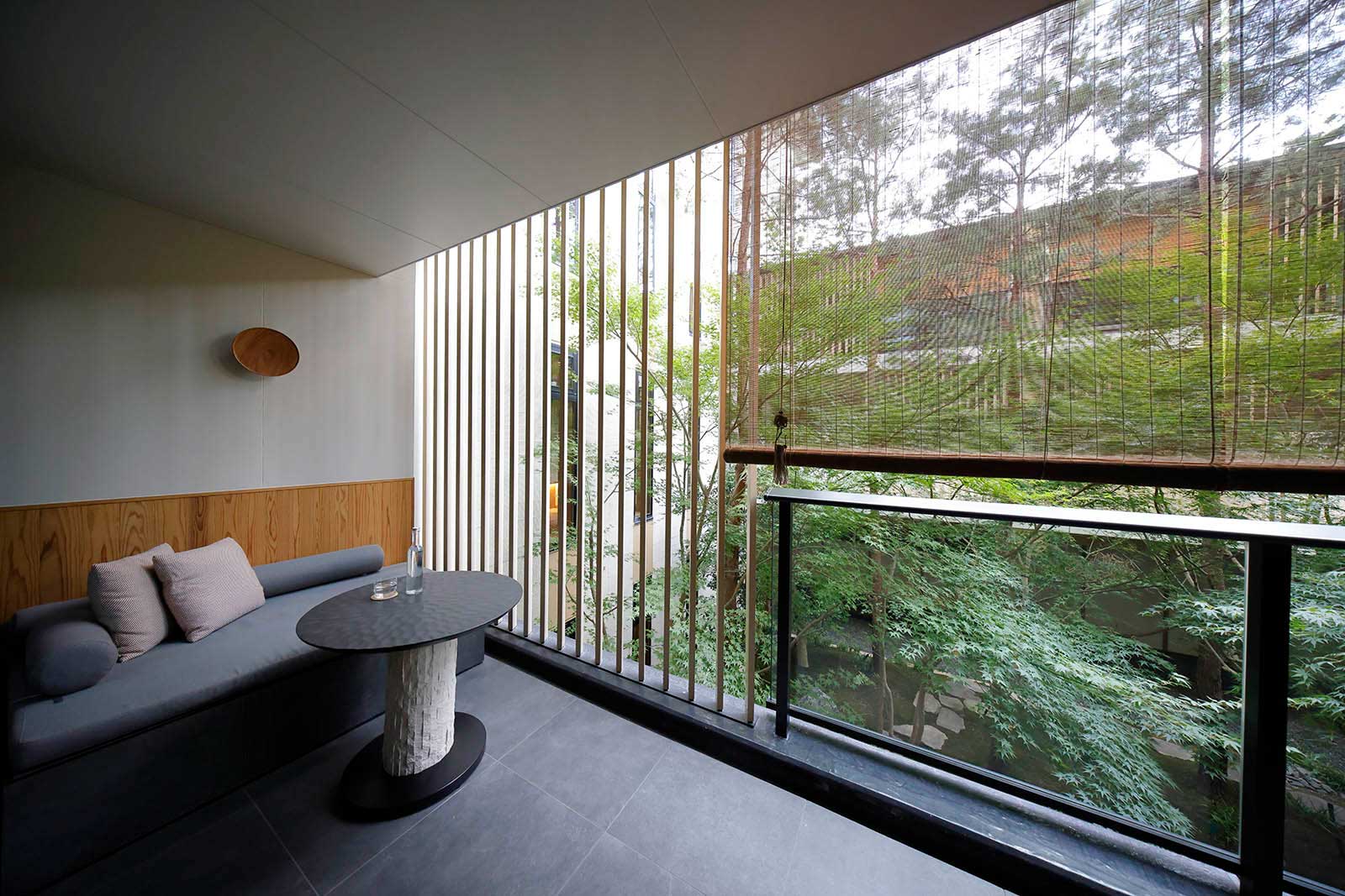 目の前には、青々とした中庭の木々が大きな窓いっぱいに広がり、一瞬で森の中のリゾートに来たかのよう。ふわりと漂う「鞍馬山の雨上がりの朝」をイメージして調香された和の香りに包まれると、ここが京都だということを感じます。