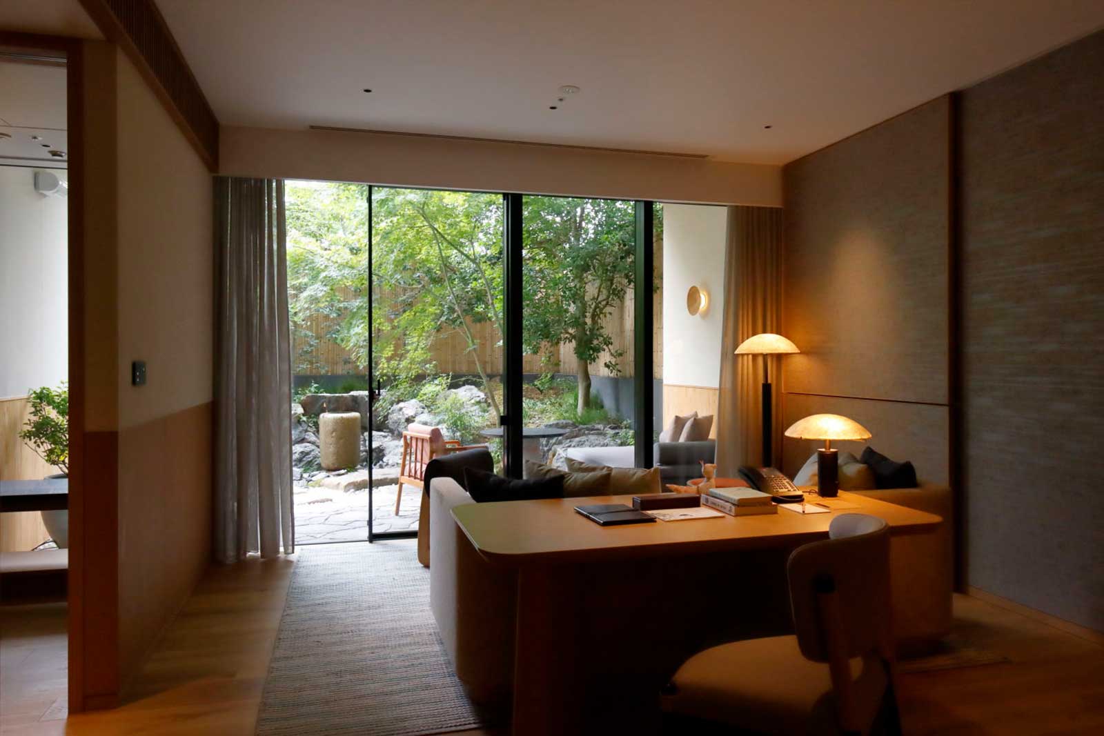 約42〜238平方メートルまでの多様な客室は、木と和紙のテクスチャーが穏やかな陰影をつくるナチュラルなインテリア。大きめのテーブルやソファも設置され、心地よさと機能性を兼ね備えています。眺望は「中庭」「豊国神社の庭」「京都市街(樹冠・屋根・寺社の見える景観)」に面しており、京都の街中とは思えないような静けさに包まれています。
