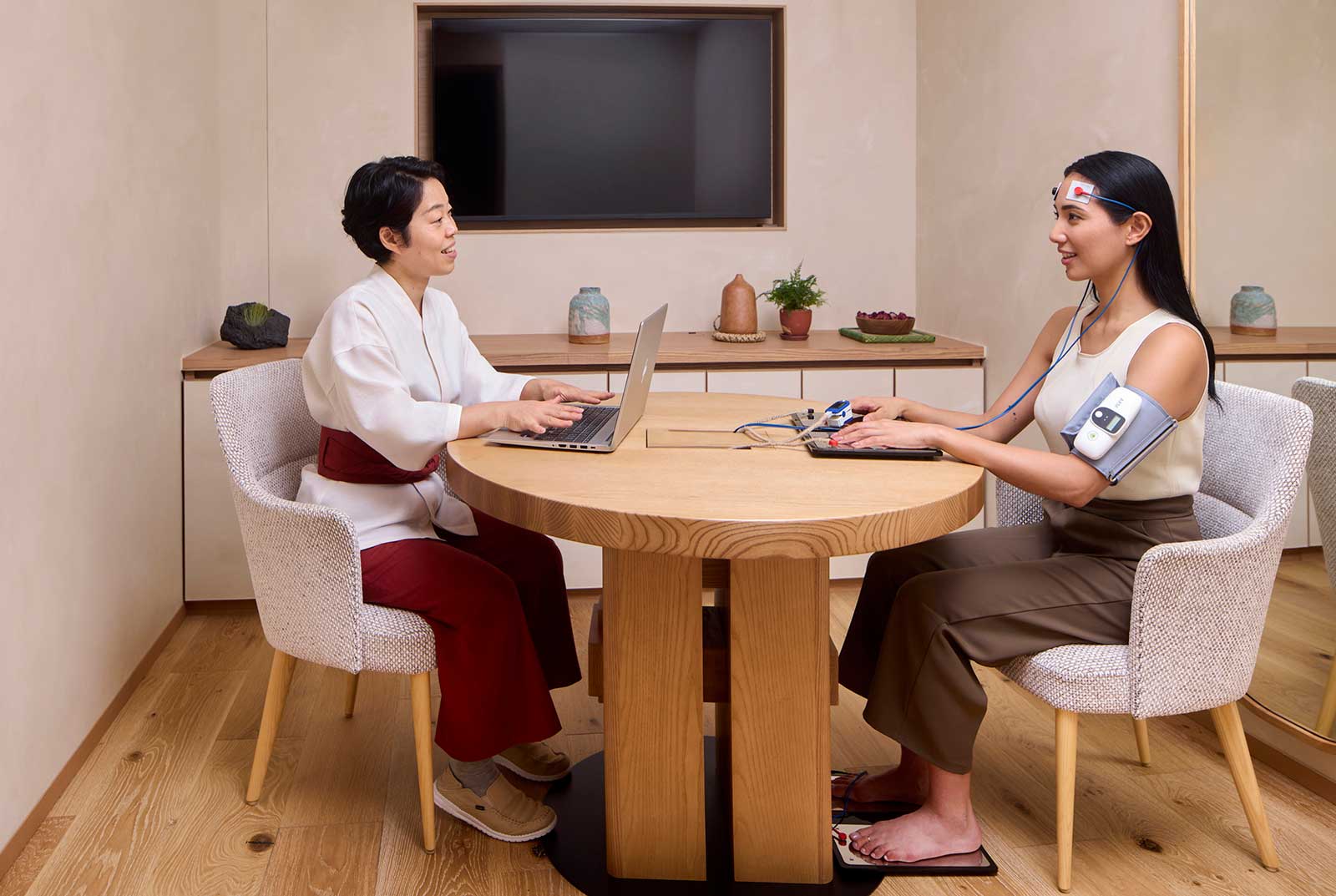 施術は、まずは自分の状態を知るウェルネス・スクリーニングから。ここでは専用の機器を使い、自分の状態をスクリーニング。約30の主要バイオマーカーと10のインジケーターでチェックし、ストレスの状態から血流のよしあしまでを数値化。プロのアドバイスで現在のからだの状態を知ったのち、「ドリームキャッチャー」という施術でからだをリラックスさせます。