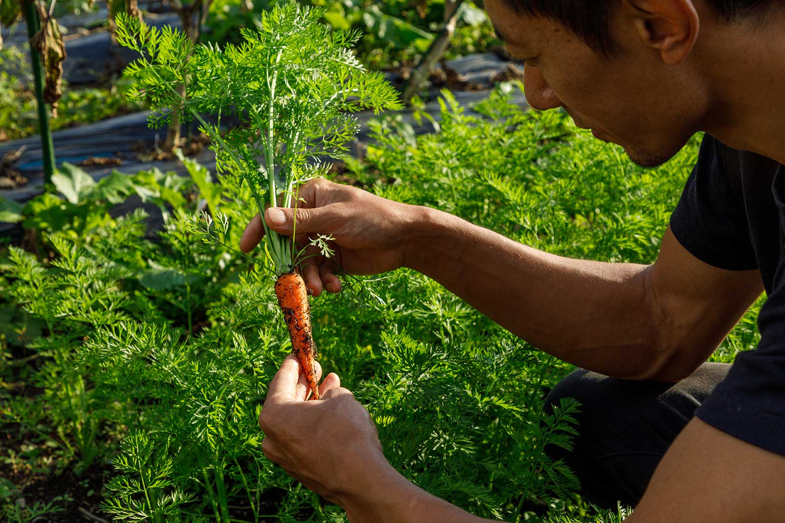 「毎日畑に行って収穫すると、野菜の成長過程での風味や味わいの違いがよくわかりますね。例えば出始めのケールは柔らかくて甘い。だから生で食べてほしいなと思う。シーズン終わりのケールは葉が強くて味も濃い。だから火を通してその味を引き出したりします。若いにんじんは水分を含んで皮もうすく、柔らかい。日々の野菜の味は、その日だけのもの。だから僕はレシピをもたずに、その日採れた野菜を見ながら料理の仕方を決めていきます」と、畑を案内してくれたタシ氏は、笑顔で教えてくれた。