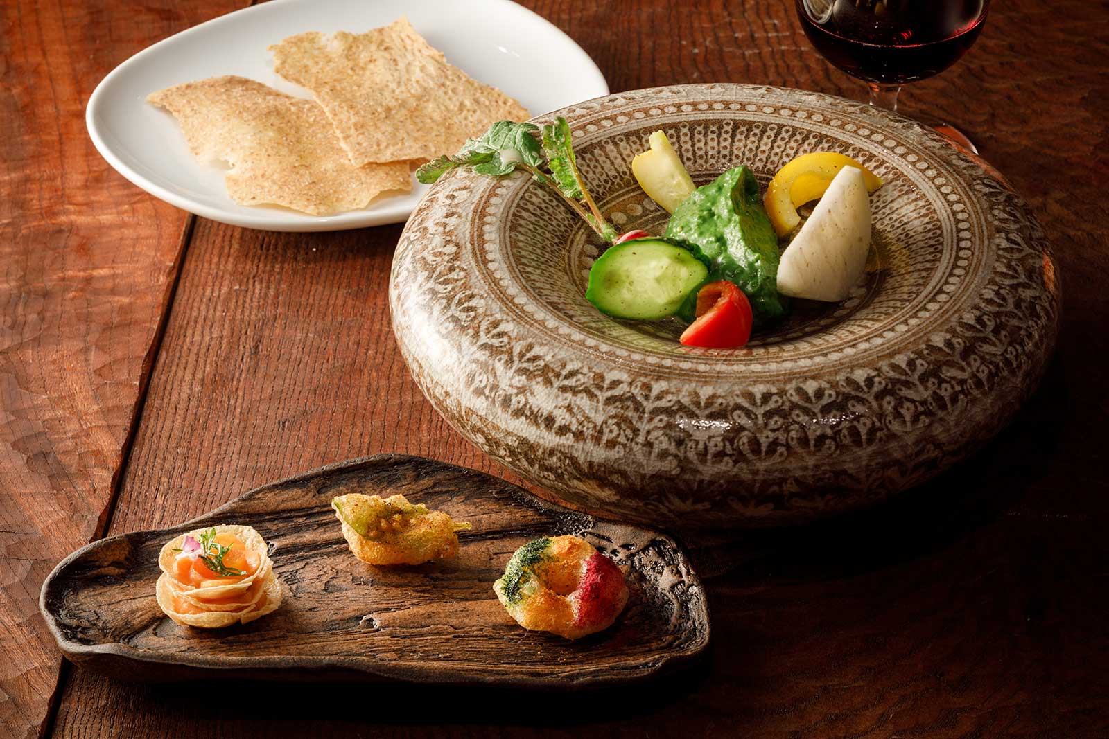「ゲストには、まず畑で朝採ったばかりの野菜を味わってほしい」というタシ氏の思いから、ほとんど手をかけない生の野菜がディップとともに出てくる。