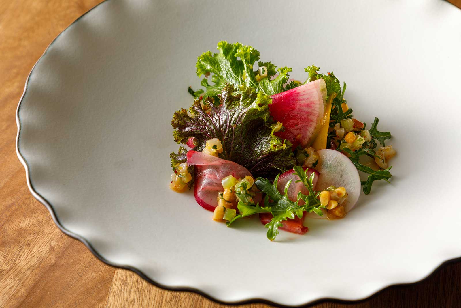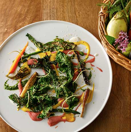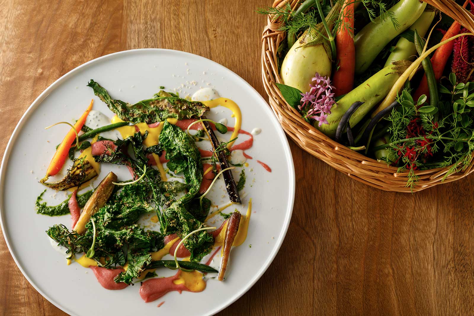 - タシ氏みずから畑に立ち、毎日収穫する“FARM DRIVEN”な野菜が料理の主役。