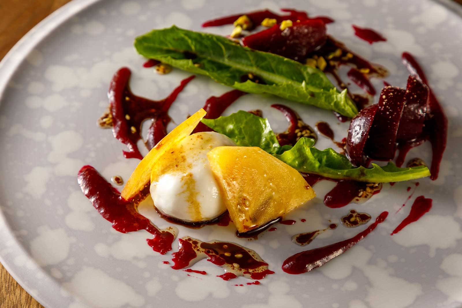 続く「Beets」という料理は、ビーツ好きのタシ氏がビーツを主題に作った一皿。ローストしたビーツと、ピクルスにしたビーツをビーツの果汁と胡麻油で作ったソースで食べる。付け合わせは、自家製のモッツァレラチーズと柿だ。