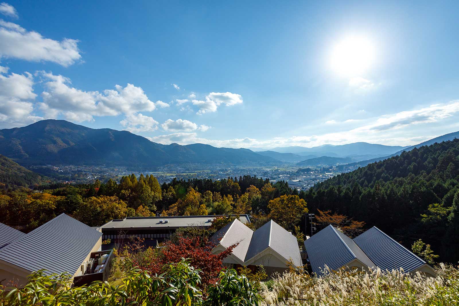 湯布院の中心部から少し離れた山の高台に立つオーベルジュは、4万4千平米の敷地を有し、全室にかけ流しの温泉をひいた10棟のヴィラ、9室の客室、そしてレストランや温室、サウナなどの施設を備えている。