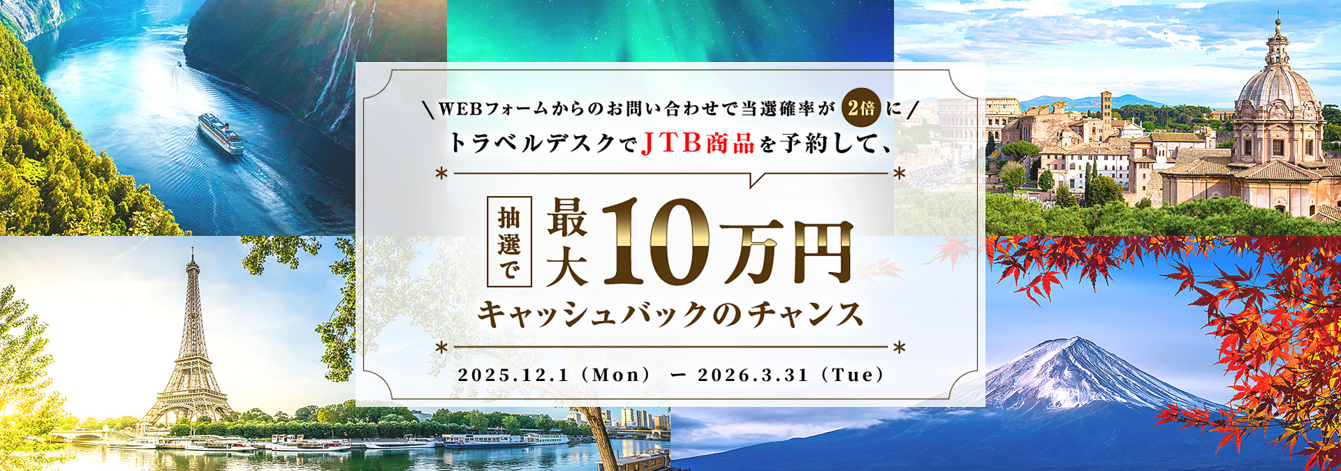 トヨタファイナンス トラベルデスクを通じてJTBの旅行商品をご予約・対象カードでお支払いただいたお客さまを対象に、抽選で16名さまに最大10万円をキャッシュバックするキャンペーンを実施いたします。